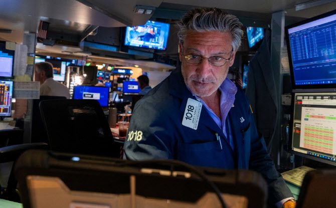뉴욕증권거래소에서 트레이더가 모니터를 보고 거래동향을 파악하고 있다. (사진=AFP) |