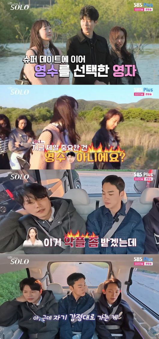 영자는 영수를 선택했지만 정숙과 함께 2:1 데이트를 해야 하는 사실에 표정이 좋지 못했다. 정숙 역시 한숨을 쉬며 “아 진짜. 여기 제작진들 너무 나쁘다. (여자들이) 선택 안 했으면 방금 전에 데이트 하고 온 사람 상처 줄 일 없는데”라고 제작진 탓을 했다.