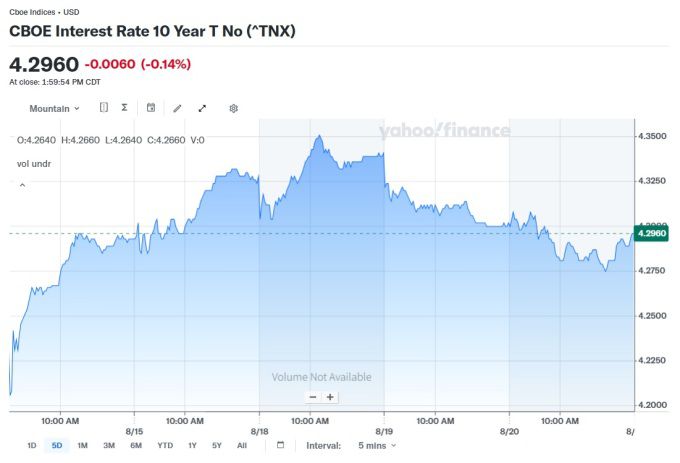[서울=뉴스핌] 고인원 기자= 미국 국채 금리가 20일(현지시간) 소폭 하락하며 안정을 찾았다. 투자자들은 이번 주 와이오밍주 잭슨홀 심포지엄에서 예정된 제롬 파월 미 연방준비제도(Fed) 의장의 발언을 주시하며 신중한 관망세를 이어갔다.