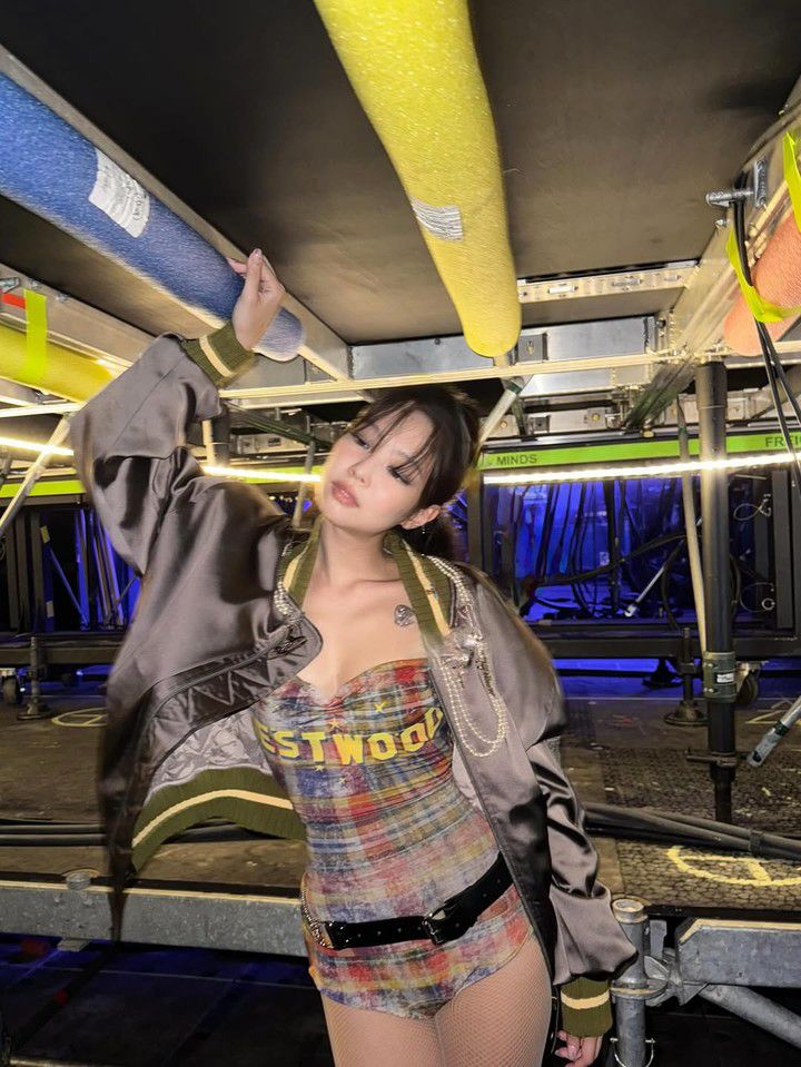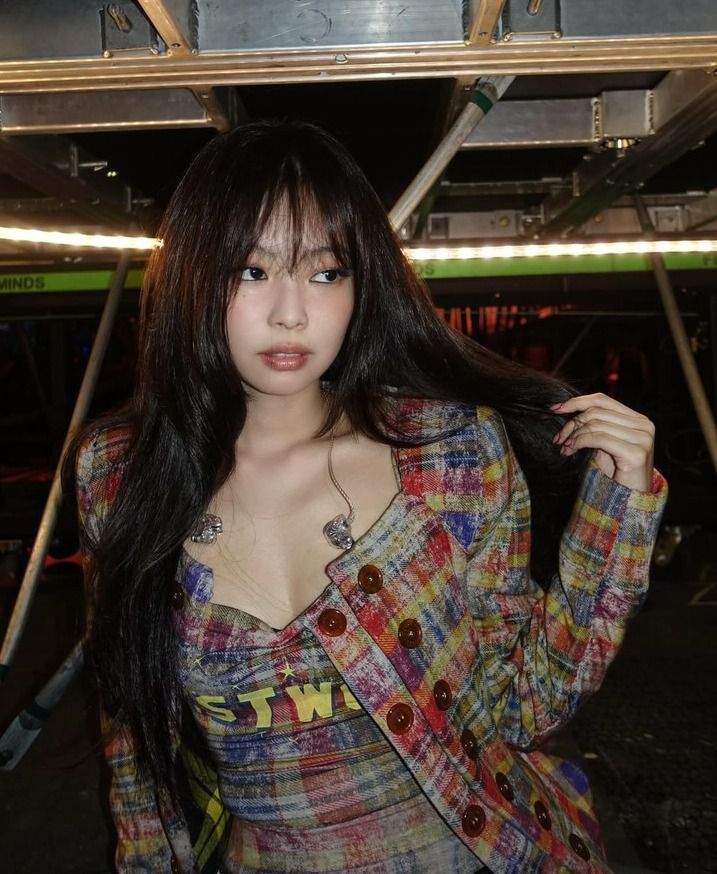 사진 속 제니는 체크 패턴 셋업을 착용해 시선을 사로잡았다. 클래식한 자켓에 몸매 라인을 살린 보디슈트를 매치해 무대 위 아이돌다운 카리스마를 드러냈다. 그는 자연스럽게 머리카락을 넘기며 무심한 듯 시크한 분위기를 연출했다.
