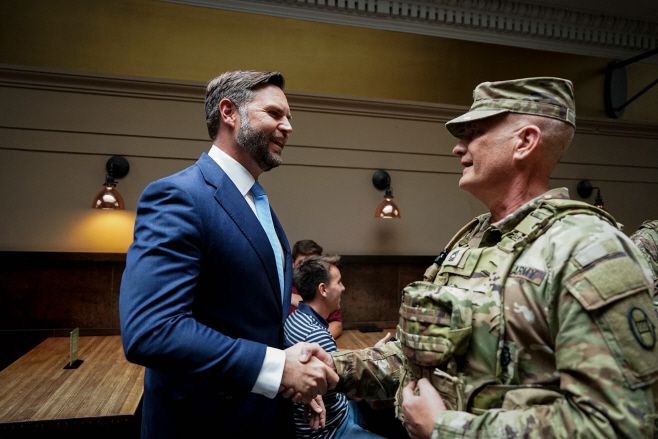 JD 밴스 미국 부통령이 20일(현지시간) 워싱턴DC 유니언 스테이션에서 주방위군 대원과 악수하고 있다./AFP 연합뉴스 |