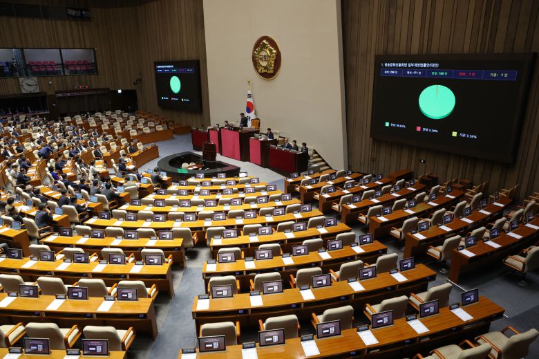 21일 국회 본회의에서 방송문화진흥회법 일부개정법률안이 통과되고 있다. [연합] |