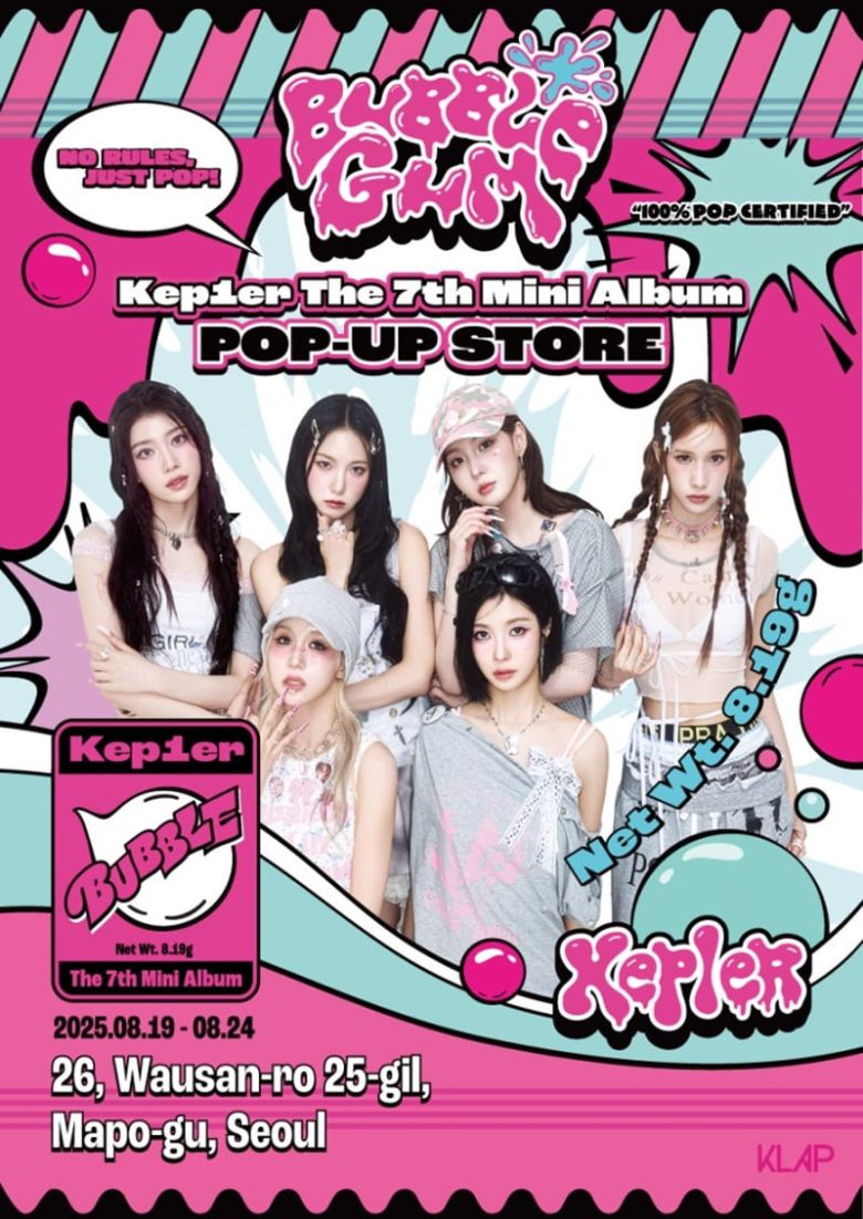 케플러(Kep1er 최유진, 샤오팅, 김채현, 김다연, 히카루, 휴닝바히에, 서영은)는 지난 19일 일곱 번째 미니앨범 ‘BUBBLE GUM(버블 검)’으로 컴백한 가운데 오는 24일까지 6일간 서울 홍대갤러리 키르큐펠에서 팝업스토어를 운영하며 팬들과 특별한 만남을 이어간다.
