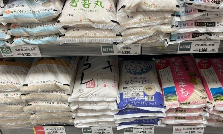 지난 20일 일본 도쿄 신주쿠 한 중대형 슈퍼마켓에서 진열대에 쌀이 5㎏당 최대 5천엔(세금 포함)에 팔리고 있다. 홍석재 기자 |