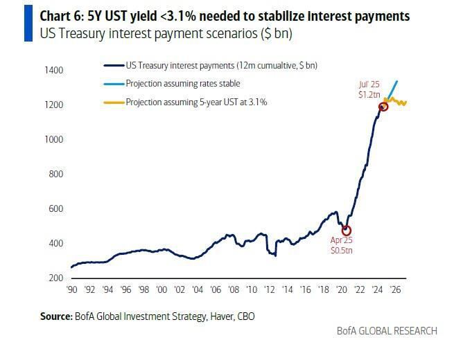 미국 정부가 지불하는 연간 이자비용 추이(남색, 단위: 10억달러)와 현재 시장금리 수준이 유지될 경우(파란색), 5년물 국채 금리를 3.1%로 고정할 경우(노란색)의 각각 추이 [자료=뱅크오브아메리카]