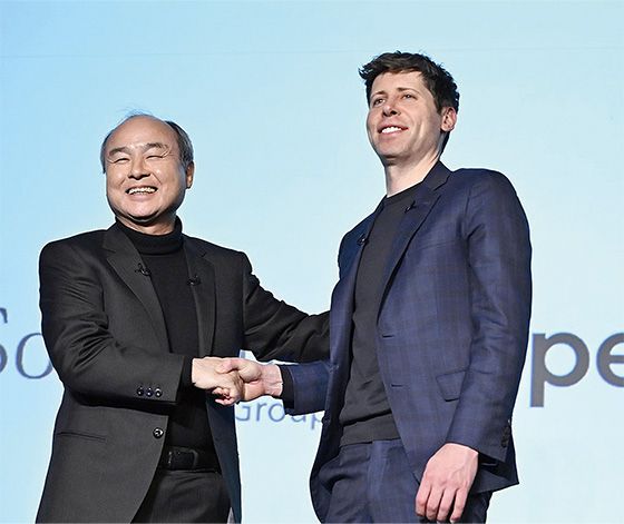 손정의 소프트뱅크그룹 회장(왼쪽)과 샘 올트먼 오픈AI 최고경영자(CEO)가 지난 2월 일본 도쿄에서 열린 행사에서 만나 악수하고 있다. <사진 연합뉴스> |