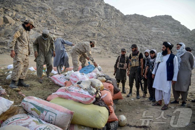 (스핀 볼닥 AFP=뉴스1) 권영미 기자 = 20일(현지시간) 탈레반 대원들이 칸다하르의 스핀 볼닥 지역 한 들판에서 압수된 마약을 소각하기 위해 준비 중인 보안 요원들을 점검하고 있다.2025.08.20. ⓒ AFP=뉴스1