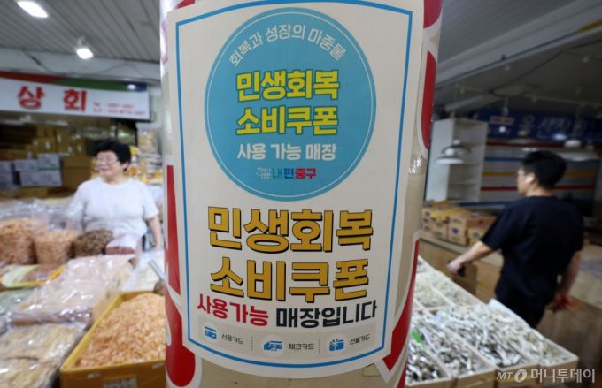 [서울=뉴시스] 홍효식 기자 = 소상공인 대다수가 민생회복 소비쿠폰 정책에 만족하는 것으로 조사됐다. 12일 소상공인연합회가 발표한 민생회복 실태조사 결과에 따르면 소상공인 70.3%가 민생회복 소비쿠폰 정책에 대해 만족한다고 답했다.  12일 서울 중구 중부시장에 민생회복 소비쿠폰 사용 가능 매장 안내문이 부착되어 있다. 2025.08.12. yesphoto@newsis.com /사진=홍효식