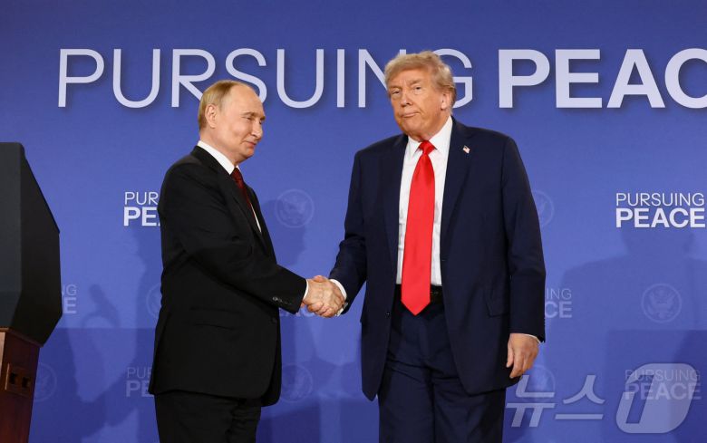 도널드 트럼프 미국 대통령과 블라디미르 푸틴 러시아 대통령이 지난 15일 미국 알래스카 앵커리지 엘먼도프-리처드신 합동기자에서 열린 우크라이나 전쟁 종식을 위한 회담 후 기자회견을 열고 악수하고 있다. 2025.8.15 ⓒ 로이터=뉴스1 |