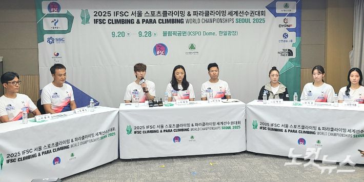 21일 서울 송파구 올림픽파크텔에서 열린 '2025 IFSC 서울 스포츠클라이밍 & 파라클라이밍 세계선수권대회' 프레스컨퍼런스(미디어데이)에서 발언하고 있는 이도현(사진 맨 왼쪽에서 세번째). 한국 대표팀 박희용 감독은 맨 왼쪽에서 다섯번째. 동규기자 |