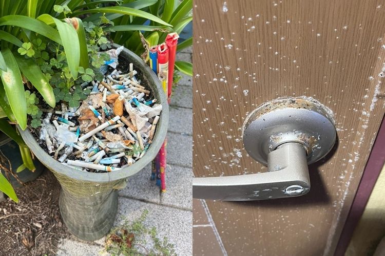 A씨 주장에 따르면 해당 펜션 주차장 한켠 화분엔 담배꽁초들이 지저분하게 방치돼있었다. 그는 “숙소 들어가자마자 아주 곰팡이 냄새가 진동했다. 주차장 담배 꽁초는 아이 보기 민망할 정도로 듬뿍 쌓여 있었다”며 사진을 첨부했다. 공개된 사진에는 관상목이 들어가 있어야 할 화분에 담배꽁초들이 잔뜩 들어가 있었으며 한쪽엔 불꽃놀이용 폭죽도 세워져 있다.