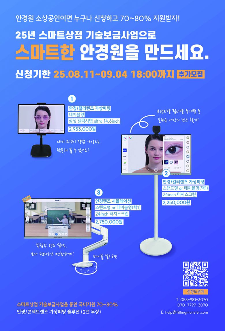 스마트상점 기술보급사업은 내달 4일 18시까지 신청할 수 있다. 자세한 사항은 인터비젼(053-981-3070, 070-7797-3070, help@fittingmonster.com)으로 문의하면 된다.