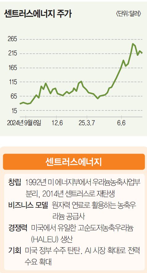 흥미롭게도 미국이 AI에 돈을 쏟겠다고 밝혔는데 의외의 산업이 떴다. 바로 원전 기업이다. 투자가들은 AI 시대가 무르익을수록 전력 수요가 더 커지고 그중에서도 원전이 수혜를 입을 수 있다는 점에 주목했다. 원전 기업 중에서도 급등세를 탄 종목이 센트러스에너지(Centrus Energy·이하 센트러스)다.