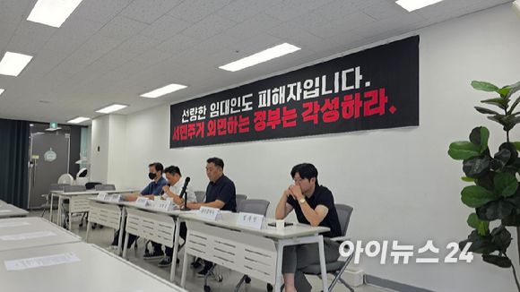 비아파트 임대인 등으로 구성된 한국임대인연합은 21일 기자회견을 열고 HF와 HUG의 전세보증 기준 개선을 촉구했다.