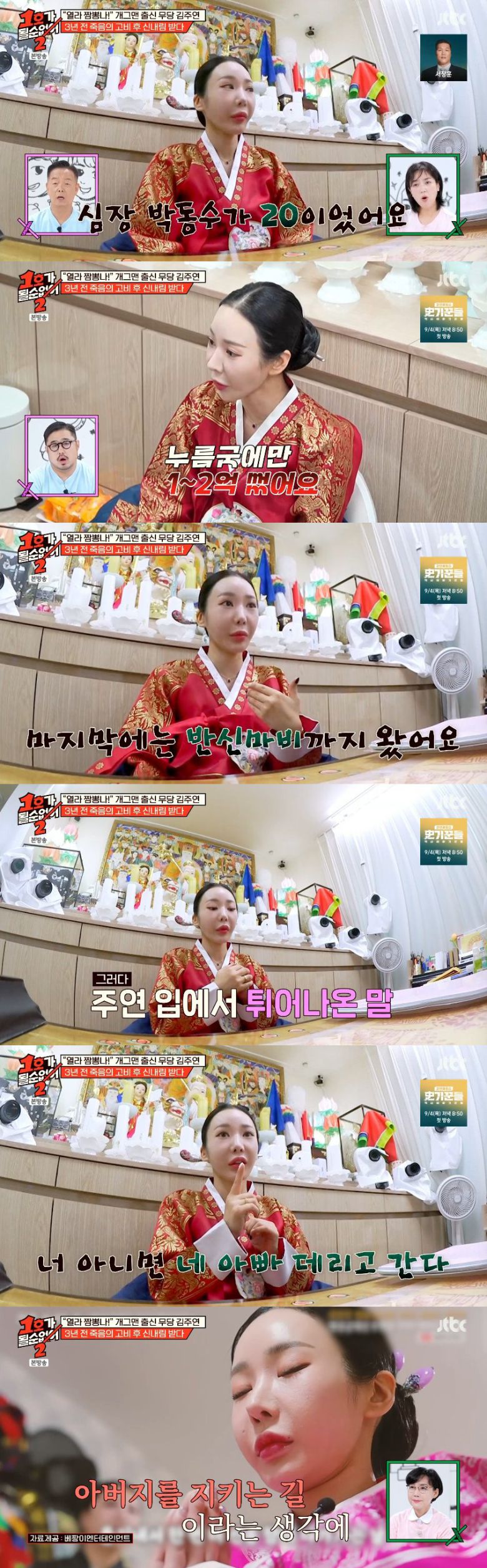 결국 신내림을 받으러 굿당에 간 김주연은 "어떤 선생님이 오늘 안 왔으면 (아버지가) 잘못될 뻔했다고 말씀하시더라. 그리고 굿을 시작하니까 (마비된) 팔이 올라갔다"고 말해 소름을 유발했다.