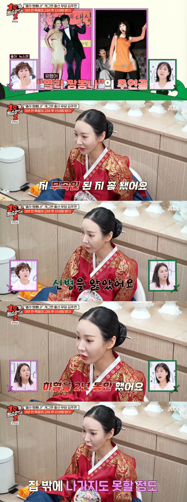 김주연은 2년 동안 하혈에 시달려야 했다고. 이어 "열이 펄펄 나고 아팠다. 못 나갔다"면서 "두 달 동안 먹지도 자지도 못했다. 그러고 12kg이 빠졌다"고 덧붙였다.