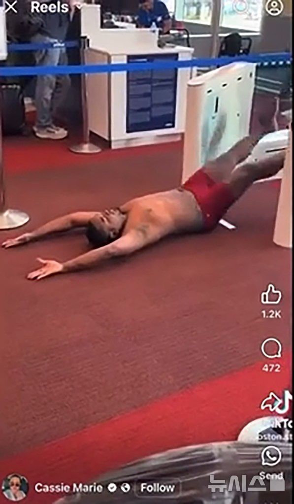 [뉴시스] 신원 미상의 남성이 보스턴의 국제공항에서 빨간색 속옷만 입은 채 바닥에 누워 있다. (사진=뉴욕포스트) 2025.08.20 |