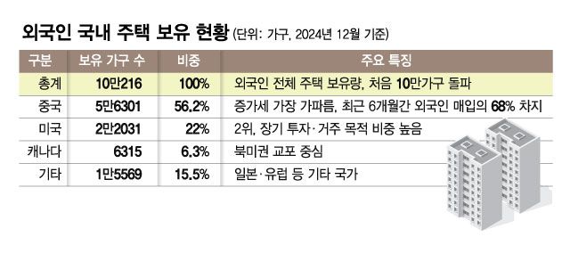 국내 외국인 부동산 보유 규모가 10만 가구를 넘어섰다. 특히 이 중 중국인이 전체 외국인 보유 주택의 절반 이상을 차지한다. 대출 규제를 받지 않는 외국인의 주택 매수는 서울과 수도권 등 일부 지역의 집값 상승 뇌관으로까지 지목된다. 국토교통부가 외국인 부동산 매입 규제를 강화하고 토지거래허가구역 지정 등 대책을 내놓은 이유다.