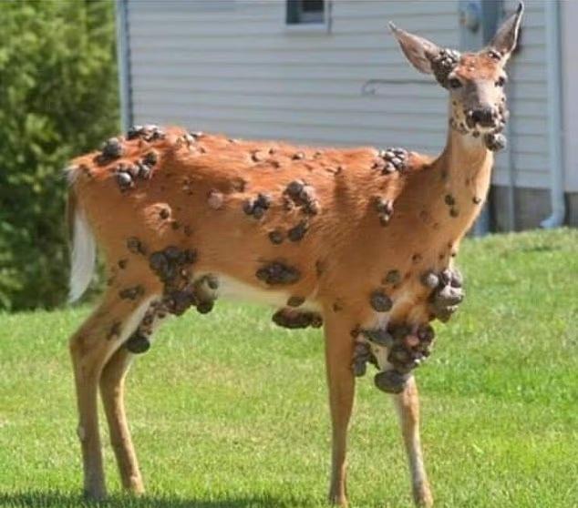 SNS(소셜미디어)에는 기괴한 모습의 사슴을 봤다는 목격담이 다수 올라왔다. 함께 공개된 사진을 보면 사슴 얼굴부터 다리까지 온몸에 검은색 혹이 가득한 모습이다.