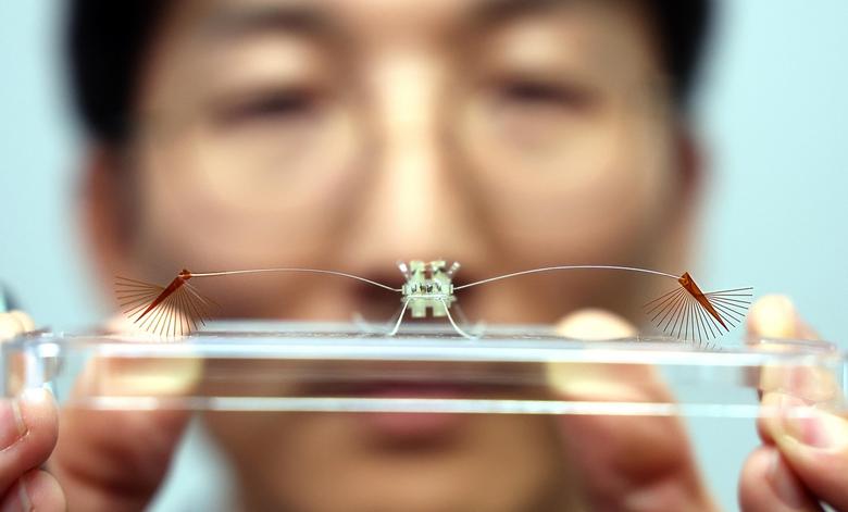 고제성 아주대 교수가 소금쟁이과 곤충 라고벨리아(Rhagovelia)를 모방해 만든 초소형 수상 로봇 ‘라고봇’(Rhagobot)을 들어 보이고 있다. [연합] |