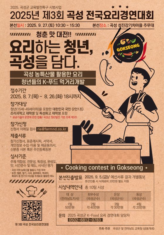 (문화뉴스 이동구 기자) 곡성군은 지역 농특산물을 활용한 K-Food 먹거리개발과 음식관광 수요 확대를 목표로 개최하는 '2025년 제3회 곡성 전국요리경연대회' 참가자를 오는 26일까지 모집한다고 전했다.