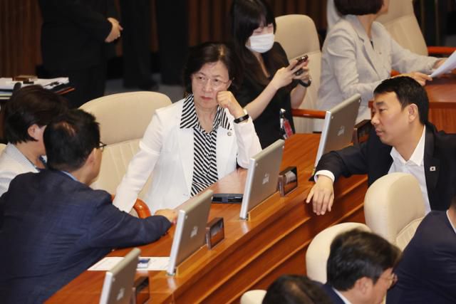 22일 서울 여의도 국회 본회의에서 더불어민주당 추미애 의원이 의원들과 대화하고 있다. 연합뉴스
