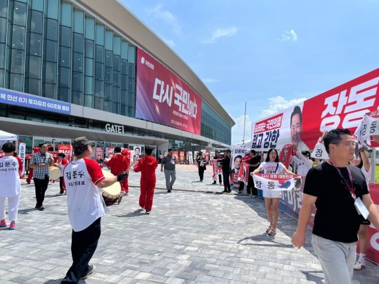 낮 최고 기온 34도가 넘는 무더위에도 전국에서 일찌감치 모인 당원들은 행사장 앞에서 세 대결을 벌였다. 김문수 전 고용노동부 장관을 지지하는 당원들이 장구와 꽹과리를 치며 응원단 분위기를 내는가 하면, 맞은 편에선 '당당한 장동혁' 손팻말을 든 지지자들이 눈에 띄었다. "정통보수 재건 적임자"라고 외치는 조경태 의원 지지자와 '새로운 보수의 다크호스' 팻말을 지키는 장동혁 의원 지지자도 보였다.