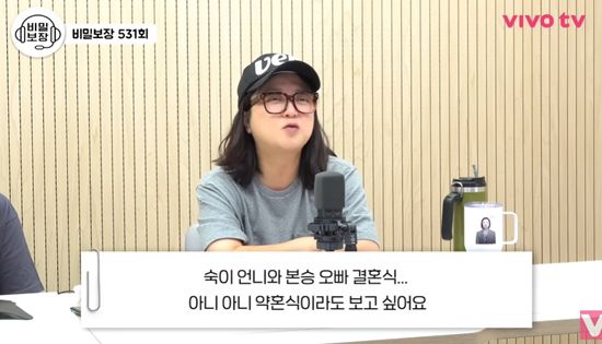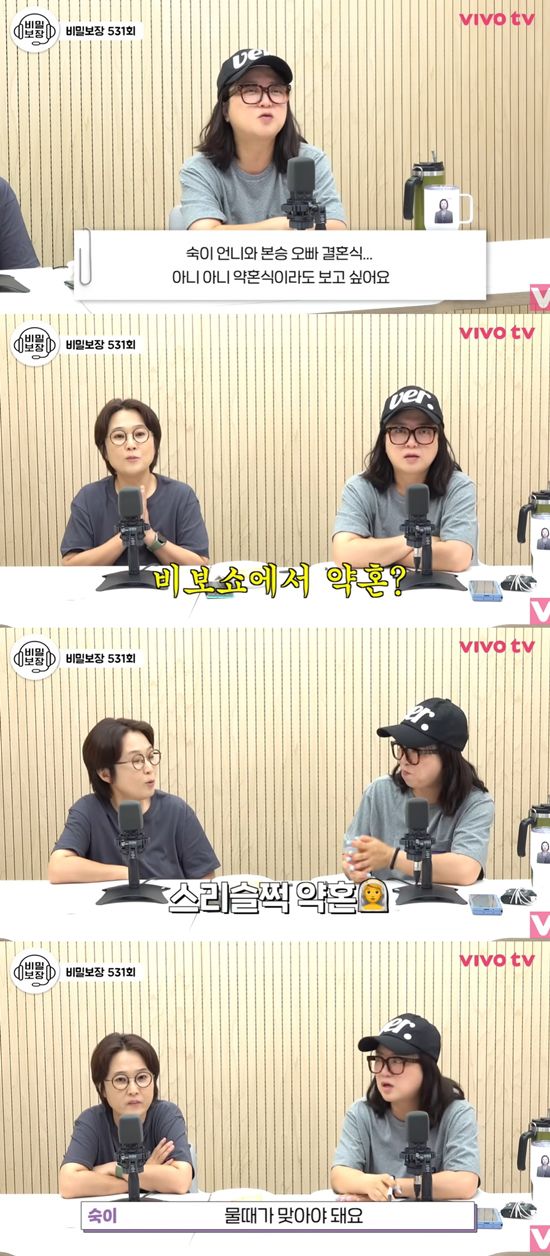 이날 한 네티즌이 "숙이 언니와 본승 오빠 결혼식...아니 약혼식이라도 보고 싶다"라고 전했다. 이에 송은이는 "이걸 비보쇼에서?"라며 반가움을 드러냈다.