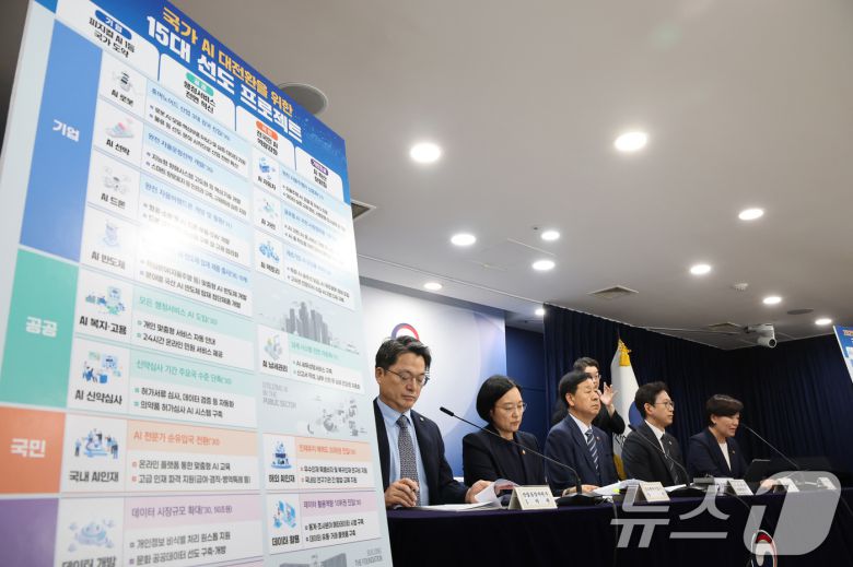구윤철 경제부총리 겸 기획재정부 장관이 22일 오후 서울 종로구 정부서울청사에서 열린 새정부 경제성장전략 관계부처 합동 브리핑에서 국가 AI 대전환을 위한 15대 선도 프로젝트를 발표하고 있다. 왼쪽부터 한성숙 중소벤처기업부 장관, 구윤철 부총리, 배경훈 과학기술정보통신부 장관, 송미령 농림축산식품부 장관. 2025.8.22/뉴스1 ⓒ News1 임세영 기자 |