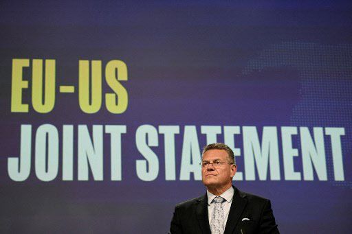 마로스 세프코비치 EU 통상담당 집행위원이 21일(현지시간) 브뤼셀에서 열린 EU-미국 관세 합의 관련 기자회견에서 발언하고 있다.(사진=AFP) |