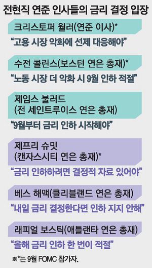 금리 인하파의 근거는 악화하는 고용 시장이다. 지난 7월 비농업 일자리는 7만3000명 늘어나는 데 그치면서 예상치(10만명)를 크게 밑돌았다. 특히 5~6월 일자리가 통계 수정을 통해 무려 25만8000명 증발하면서 고용 악화에 대한 우려를 키웠다.