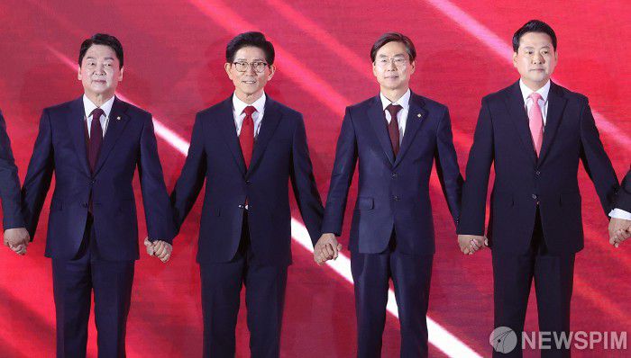 [청주=뉴스핌] 정일구 기자 = 안철수(왼쪽부터), 김문수, 조경태, 장동혁 국민의힘 대표 후보가 22일 오후 충북 청주 오스코에서 열린 국민의힘 제6차 전당대회에서 기념촬영을 하고 있다. 2025.08.22 mironj19@newspim.com |