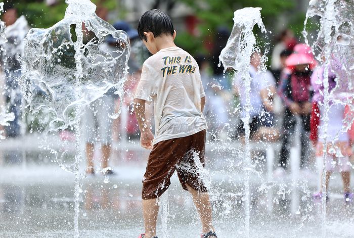 절기상 처서를 하루 앞두고 폭염이 찾아온 22일 서울 종로구 광화문광장 바닥분수에서 어린이들이 물놀이를 하며 더위를 식히고 있다. [사진 = 뉴스1]