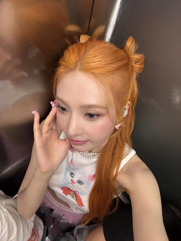 마지막 컷은 엘리베이터 안에서 찍은 셀카로, 무대 조명이 아닌 일상적인 공간에서도 인형 같은 미모로 시선을 압도했다. 리본 모양 귀걸이와 핑크톤 메이크업이 더해져 조이의 러블리 무드를 이어갔다.