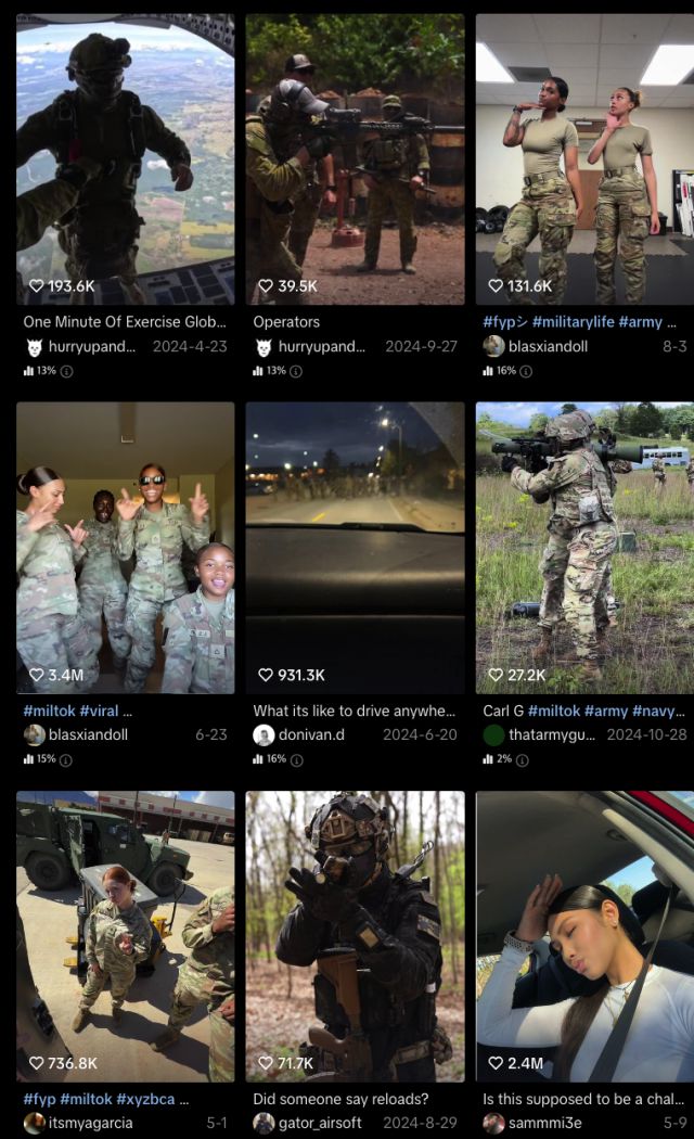 실제 틱톡 플랫폼상에서 '#밀톡'(#MilTok)이라는 해시태그를 검색하면 다수의 군대 관련 콘텐츠가 등장한다. 이중에는 자신의 평소 피부관리 일상을 보여주는 중위, 어린이집으로 뛰어가는 해군 장교, 비행 중 브이로그를 찍은 공군 조종사, 동료 여군들과 춤을 추며 즐거운 시간을 보내는 등 미 여군들의 일상을 쉽게 접할 수 있다.
