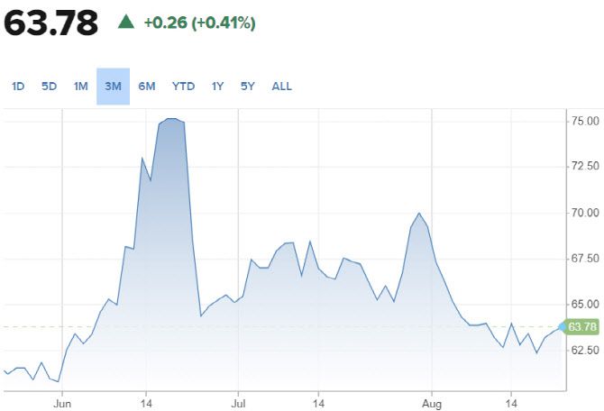 국제유가도 사흘째 상승세를 이어갔다. 뉴욕상업거래소에서 10월 인도분 서부텍사스산원유(WTI)는 전장 대비 0.14달러(0.22%) 오른 배럴당 63.66달러에 거래를 마감했다. 파월의 ‘비둘기’ 발언에 위험자산 선호가 강해졌고, 러시아와 우크라이나 정전 협정이 삐그덕거리고 있는 것도 유가 상승을 부추겼다.