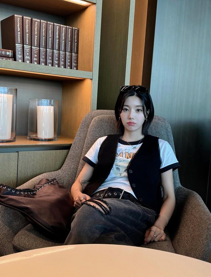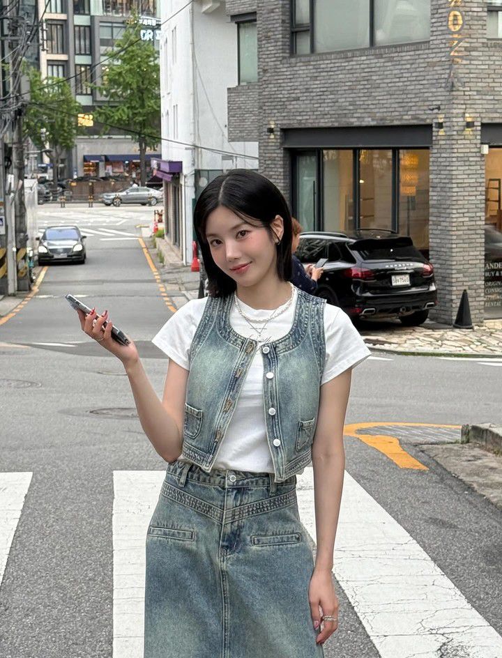권은비는 흰 티셔츠에 블랙 베스트, 찢어진 블랙 데님을 매치해 힙한 무드를 뽐냈다. 머리 위에 올린 선글라스가 쿨한 디테일을 더했고, 내추럴한 메이크업이 도시적인 매력을 강조했다.