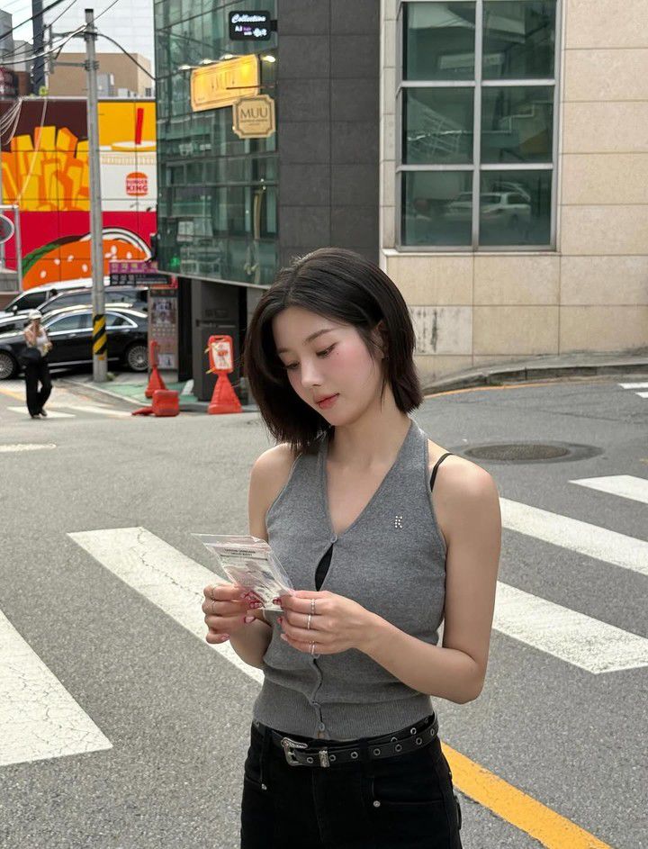 마지막 컷에서 권은비는 회색 니트 베스트 톱과 블랙 팬츠를 매치해 시크한 스트리트 감성을 드러냈다. 단정한 단발 스타일과 군더더기 없는 메이크업이 깔끔한 매력을 배가시켰으며, 무심히 거리를 거니는 모습은 여유로운 분위기를 풍긴다.