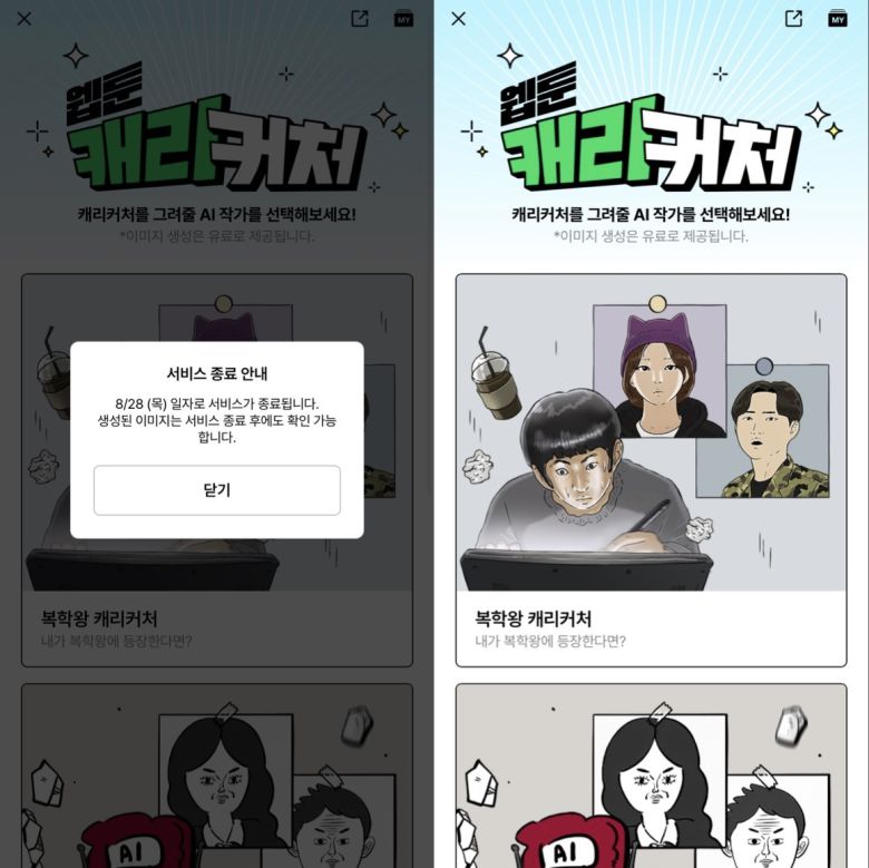 네이버웹툰의 '웹툰 캐리커처' 서비스가 8월 28일 종료된다. (네이버웹툰 애플리케이션 내 '웹툰 캐리커처' 서비스 화면 캡처)