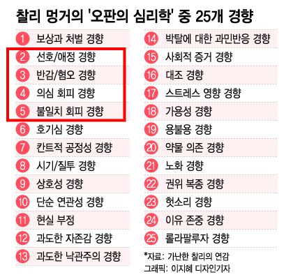 멍거는 1995년 하버드대에서 오판의 심리학을 강연한 이후 여기에 살을 보태서 2005년 '가난한 찰리의 연감'에서 25가지 경향을 상세히 소개했다. 지난 번에는 멍거가 가장 강조한 인센티브를 위주로 한 ①보상과 처벌 경향을 살펴봤다. 오늘은 ②선호/애정 경향 ③반감/혐오 경향 ④의심 회피 경향 ⑤불일치 회피 경향을 살펴보자. 특히 불일치 회피 경향은 멍거가 상당한 분량을 할애해 작성할 정도로 중요시한 경향이다.