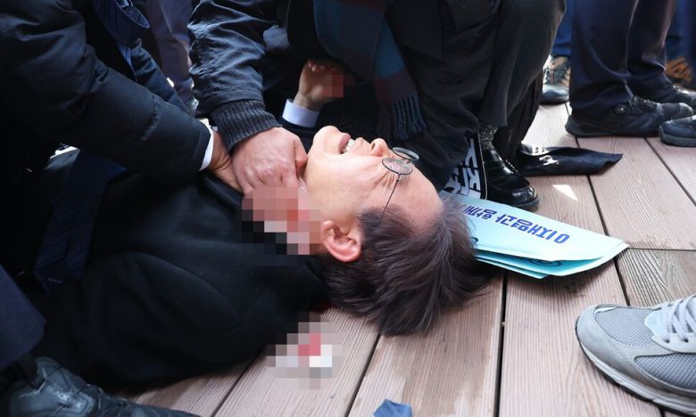 더불어민주당 이재명 대표가 2일 부산 가덕도 신공항부지 방문 중 피습을 당해 바닥에 쓰러진 채 고통스러워하고 있다. 연합뉴스