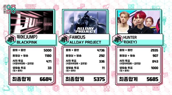 올데이프로젝트의 'FAMOUS'(페이머스)는 총점 5375점으로 3위에 이름을 올렸다. 키의 'HUNTER'(헌터)는 총점 5685점으로 2위, 블랙핑크의 '뛰어(JUMP)'는 총점 6684점으로 최종 1위를 차지했다.