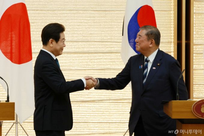 [도쿄=뉴시스] 고범준 기자 = 이재명 대통령과 이시바 시게루 일본 총리가 23일(현지 시간) 일본 도쿄 총리 관저에서 한일 공동언론발표를 마친 뒤 악수하고 있다. 2025.08.23. bjko@newsis.com /사진=고범준 |