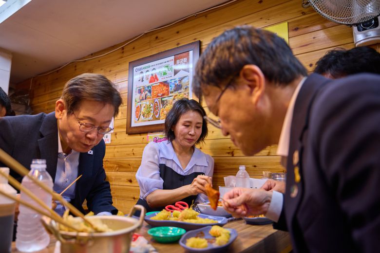 이재명 대통령과 김혜경 여사가 지난 17일 서울 은평구 연서시장을 방문해 분식을 먹고 있다. .뉴스1 |
