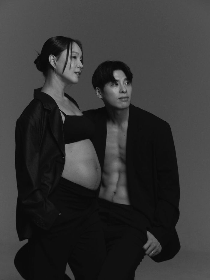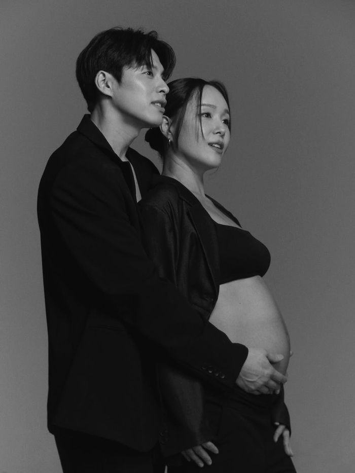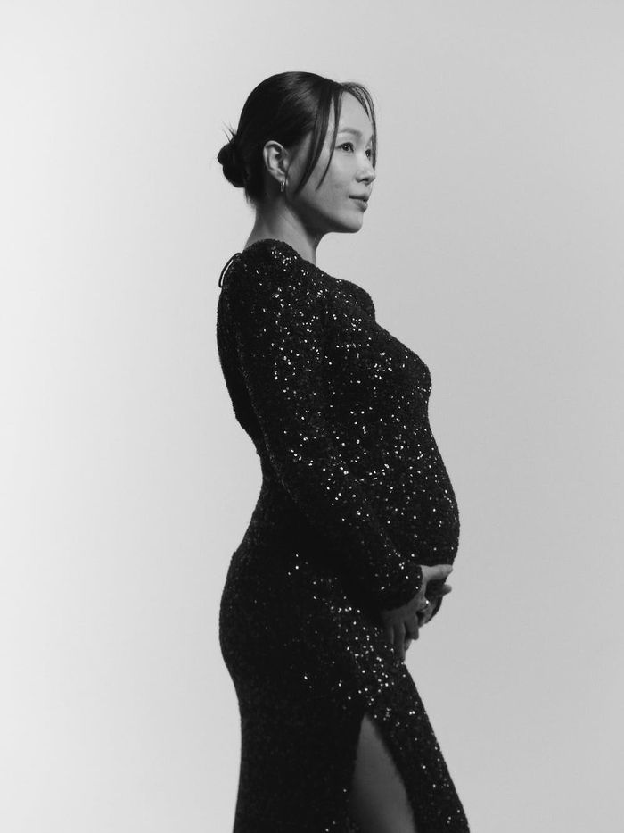 또 다른 사진에서는 임정희가 고급스러운 검은 드레스를 입고 배를 감싸 안은 채로 포즈를 취했다. 스튜디오 조명 아래 반짝이는 의상과 임신의 설렘을 담은 자연스러운 모습이 그녀의 아름다움을 한층 더 부각한다.