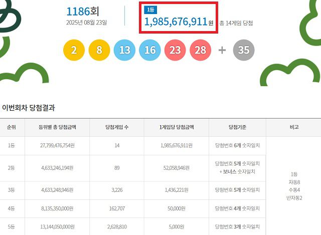 1186회 1등 당첨번호 '2, 8, 13, 16, 23, 28'···보너스 번호 '35'