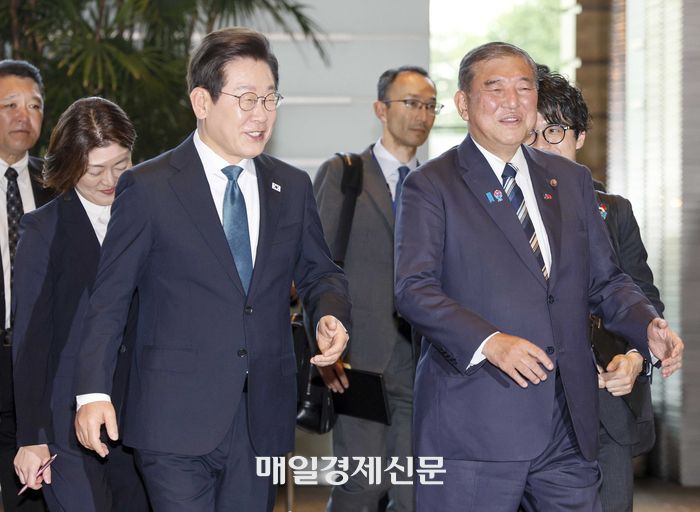 이재명 대통령이 23일 오후 일본 도쿄 총리 관저에서 한일 정상회담을 갖기 위해 이시바 시게루 일본 총리와 이동하고 있다. 2025.8.23 [도쿄/김호영기자]