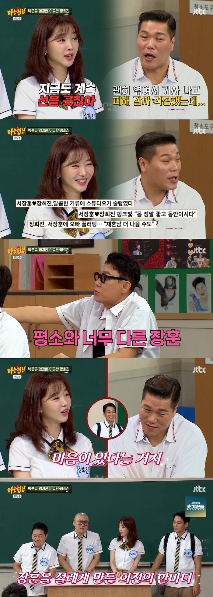이날 방송에서 장희진은 멤버들과 인연이 많다고 밝혔다. 이에 강호동과 이수근이 “장훈이랑 ‘미우새’에서?”라며 둘의 러브라인을 응원했다. 서장훈이 “아무것도 없고 그냥 인터뷰한 건데”라고 당황해하자 장희진은 “신동엽 선배님이 우리 둘을 엮어주려고 했는데 장훈 오빠가 계속 선을 긋더라고”라며 서운함을 표출했다.