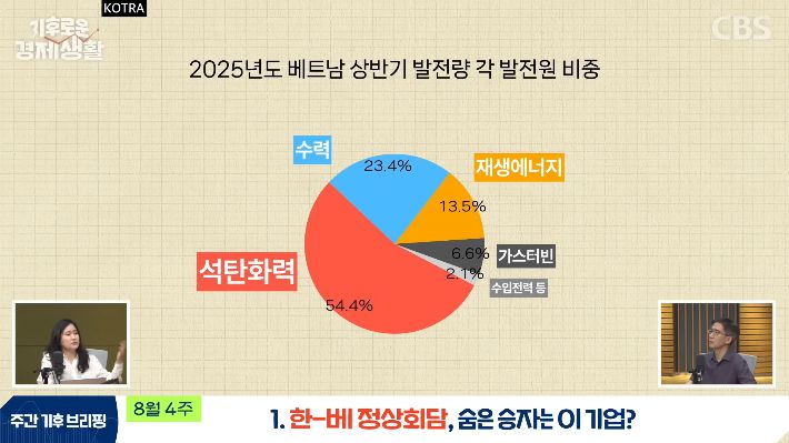 베트남이 아직은 화석 연료에 대한 의존도가 굉장히 높습니다. 올해 2025년 상반기 기준으로 베트남의 전체 전력 발전에서 석탄이 차지하는 비율이 54%가 넘었더라고요. 그다음에 수력이 23%, 재생에너지가 14% 정도 차지하고 있어요.