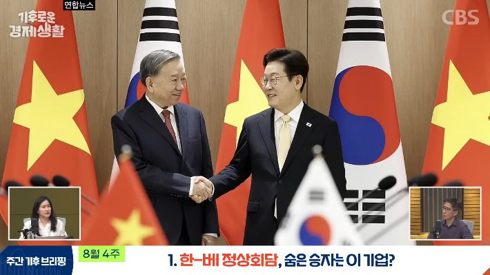 ◇ 최서윤> 이재명 정부가 출범하고 새 정부의 첫 국빈 방한이기도 했어요. 첫 국빈 방문을 베트남에서 왔다는 건데요. 외교가에선 문재인 정부가 추진했던 신남방정책 부활의 신호탄을 쐈다고 읽히고 있어요. 베트남이 중국이랑 미국에 이어서 우리나라의 3대 교역국이기 때문에 경제적으로 되게 중요한 파트너입니다.